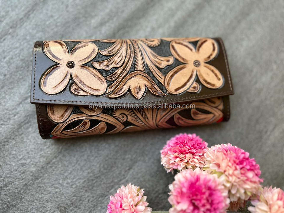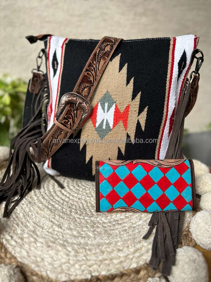 New Bohemian Hand Tooled Leather Saddle Blanket Tassel Handbag Stylish Hand Carving Leather Floral Wallet Combo Set for Women's