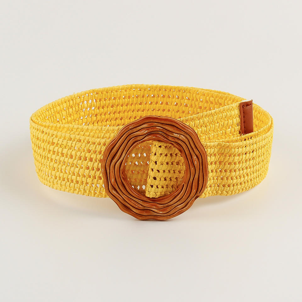 New Bohemian Vintage Women's Wide Waist Seal Candy Color PP Straw Woven Elastic Belt with Round Resin Buckle Alloy Material