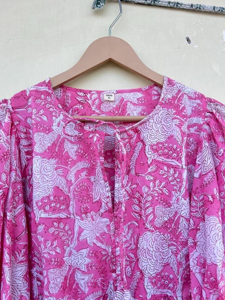New Boho Tunic Summer Beachwear Short Dress Pink Floral Cotton Midi Mini Dress for Women Gift For Her Deep V-Neck String Closure
