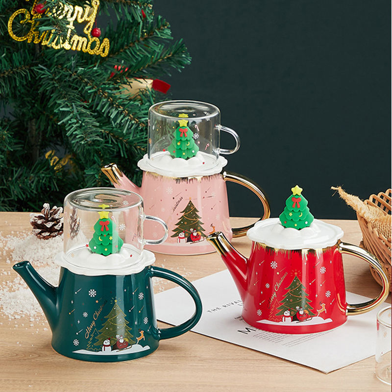 New Bone China Christmas Tree Design Teapot Glass Cup Gift Ceramic Tea Set with Tea for One Person Single Teapot
