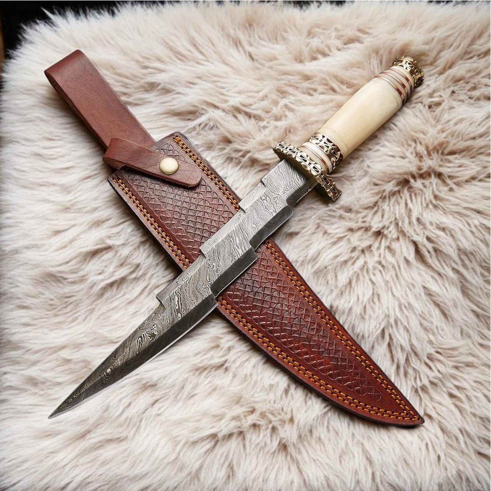 New Brand Edition Handmade Damascus Steel Outdoor Hunting Knife w/Camel Bone, Brass Spacer Handle Fixed Blade Camping Knife