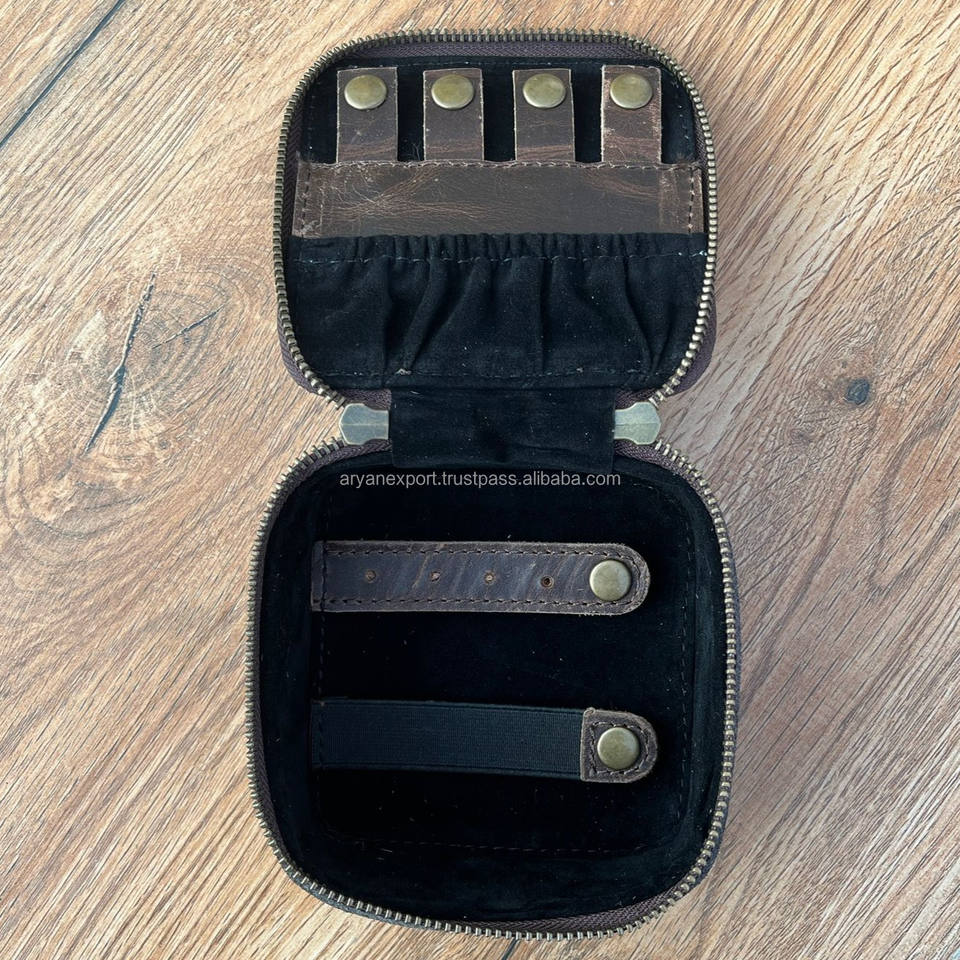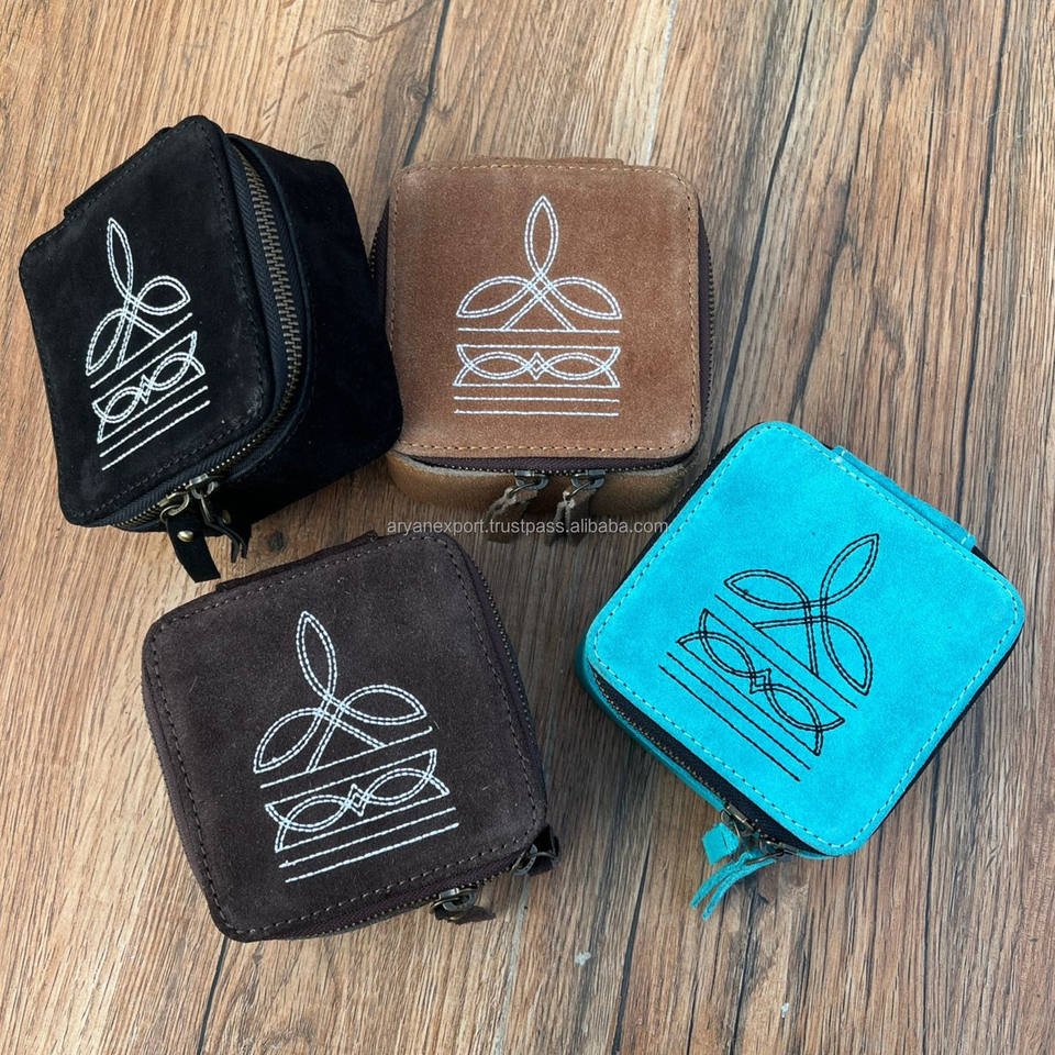 New Brown Boot Stitch Suede Leather Square Jewelry Box Western Jewelry Display Storage Case Travel Portable Zipper Jewelry Case