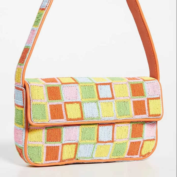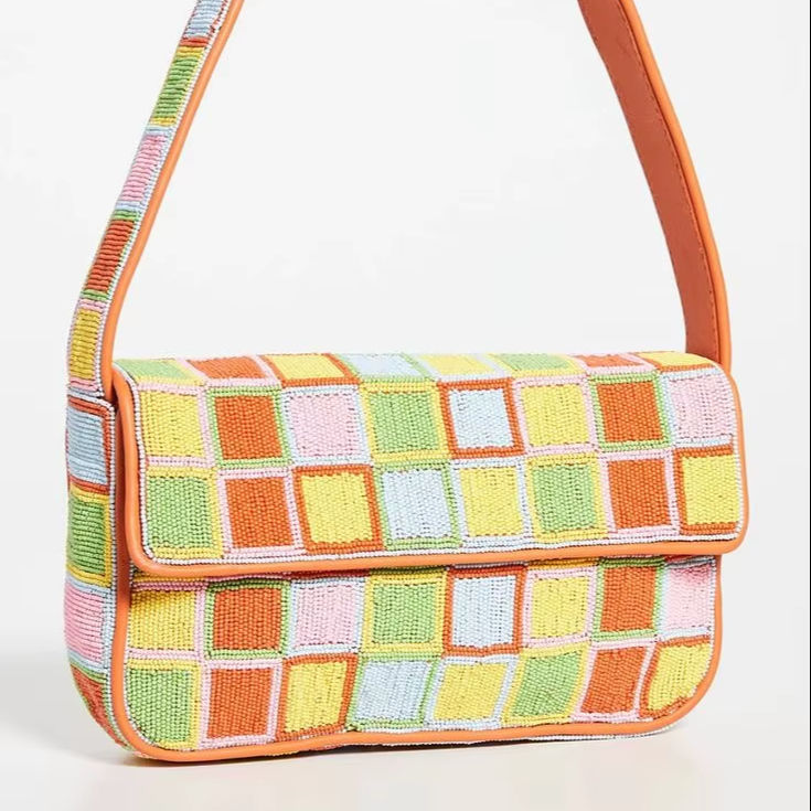 New Checkered Beaded Shoulder Bag Pastel Orange Cream Beads French Style Vintage Hand-Beaded Evening Party Soft Women Bags
