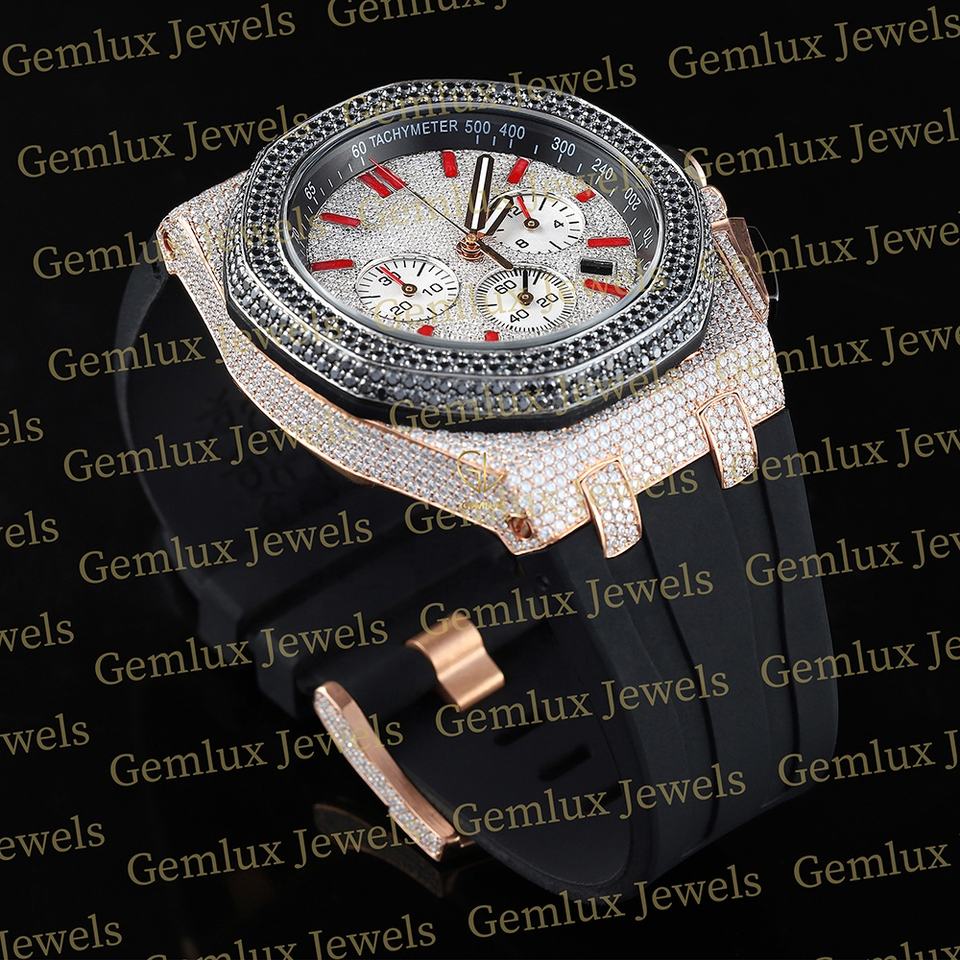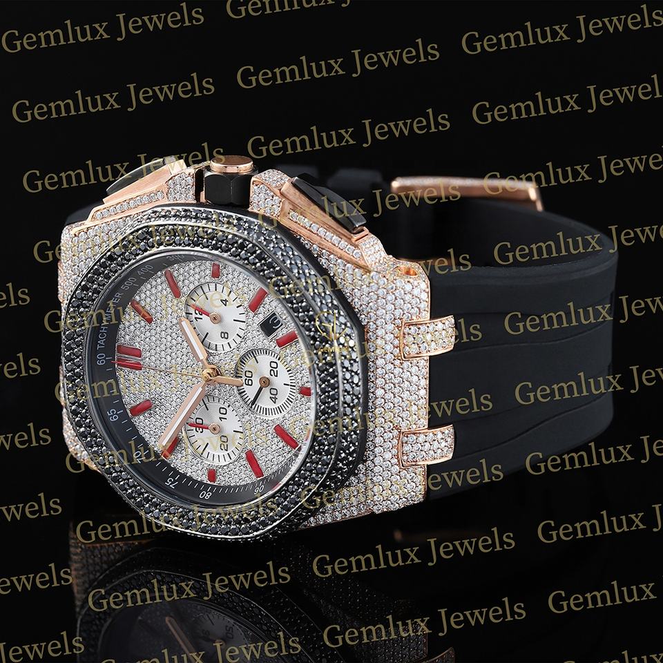 New Collection Chronograph Auto Date Black Rubber Strap Iced Out D VVS Moissanite Diamond Hip Hop Diamond Watch For Men