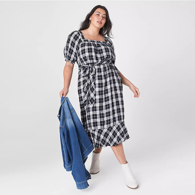 New Collection Customization Summer Square Neck Puff Sleeves Tartan Printed Casual Plus Size Midi Long Dress for Women
