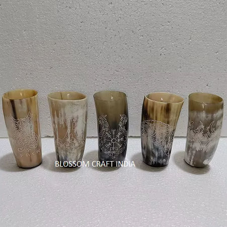 New Collection Floral Engraved Agate Buffalo Cow Horn Cup Polished Nautical Viking Horns Animal Glass Carvings Floral Blossom