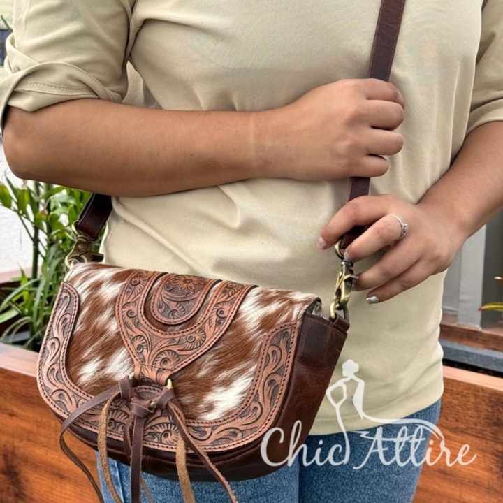 New Collection Real Cowhide Fur Hand Tooled Leather Sling Bag Carving Bohemian Bags Hot Selling Bags for Women's Use