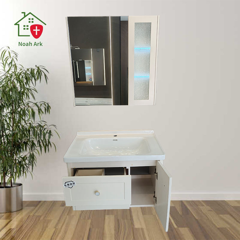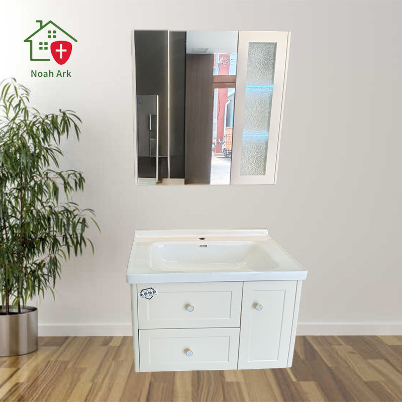 Solid Wood and PVC Bathroom Cabinet with 4 Drawers Water Resistant Elegant Vanity Furniture with Mirror Ceramic Basin