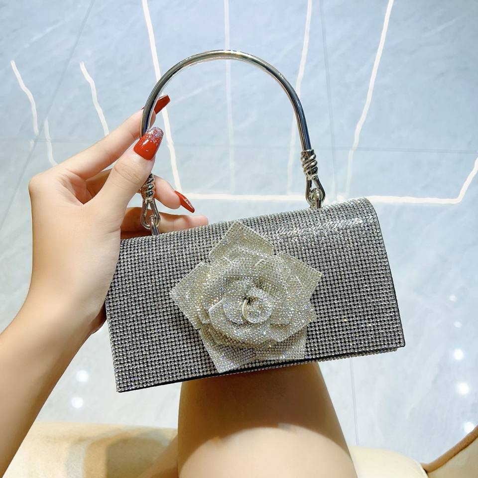 New Cross-border Polyester Handbag Full Rhinestone Flower Chain Small Square Shoulder Crossbody Daily Use Camellia Fresh Tanjing