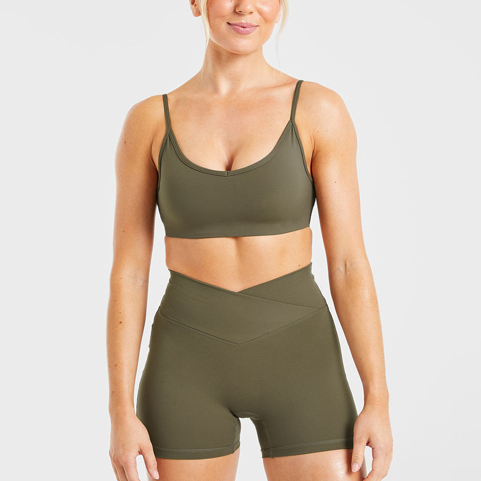 New Custom Deep Khaki Sculpt Wrap Shorts And Sports Bra With V neck & Wrap Back Women's Sets Workout Gym Two Piece Set For Women