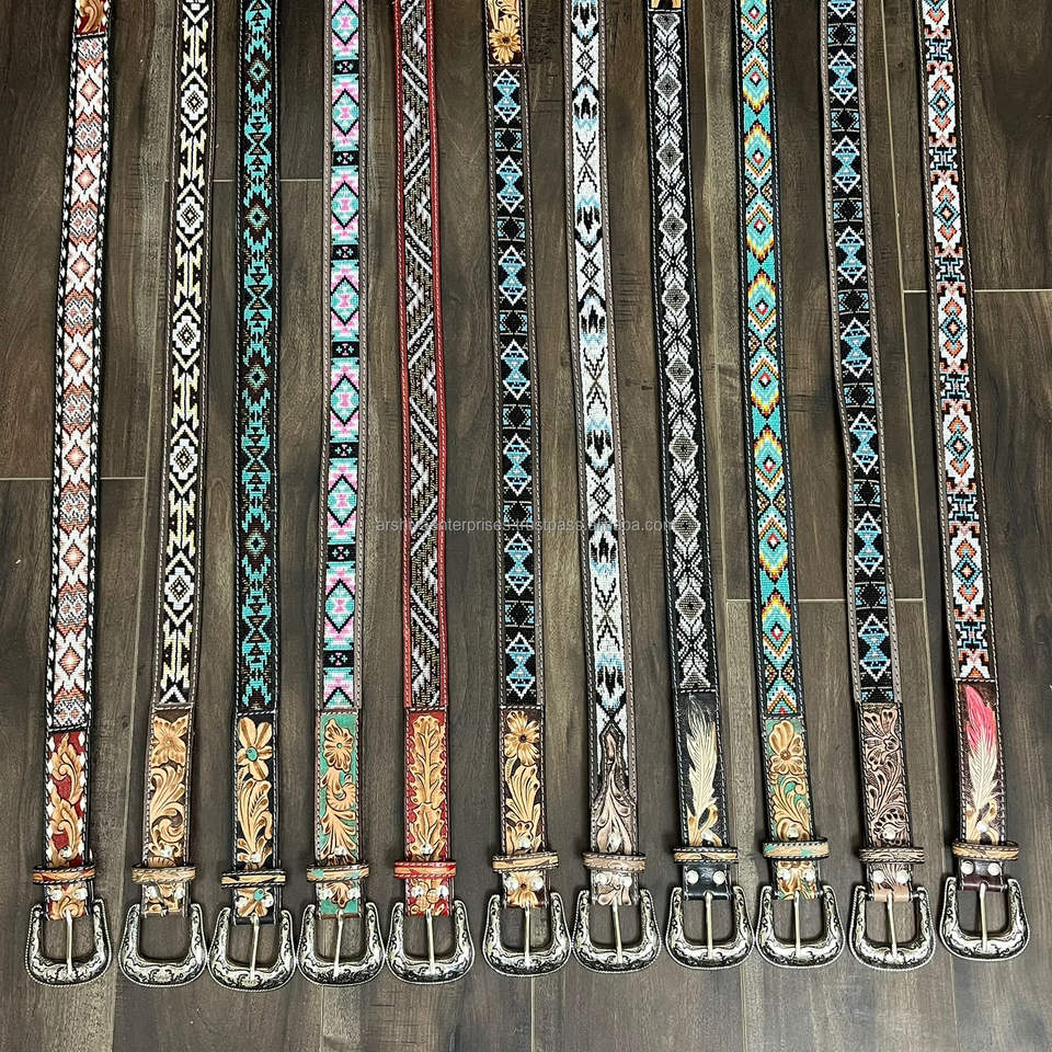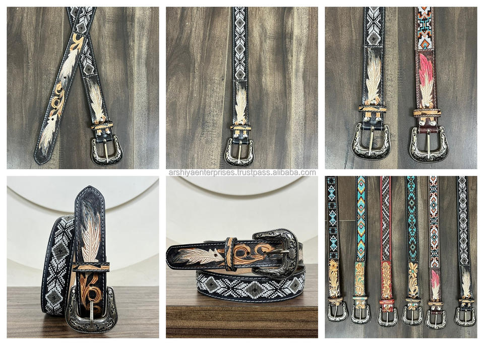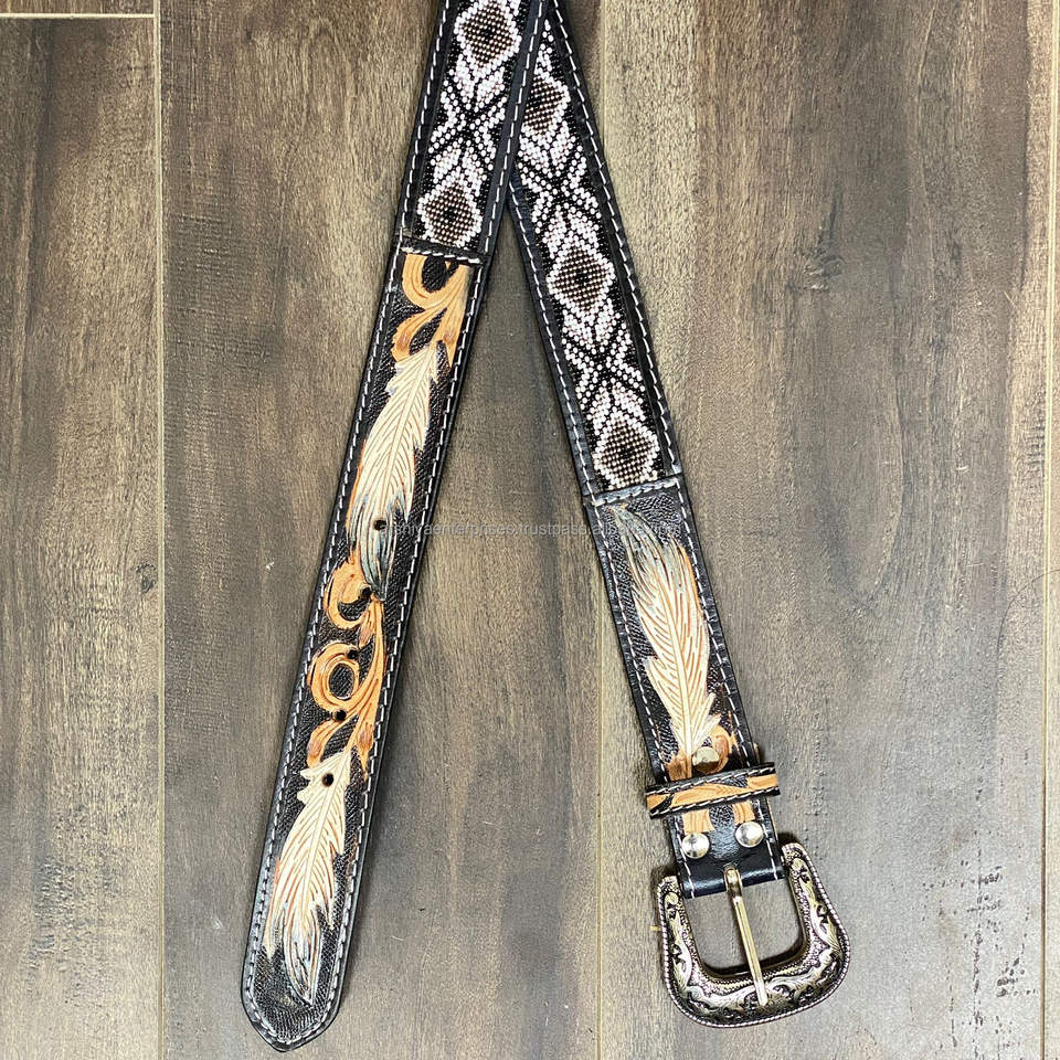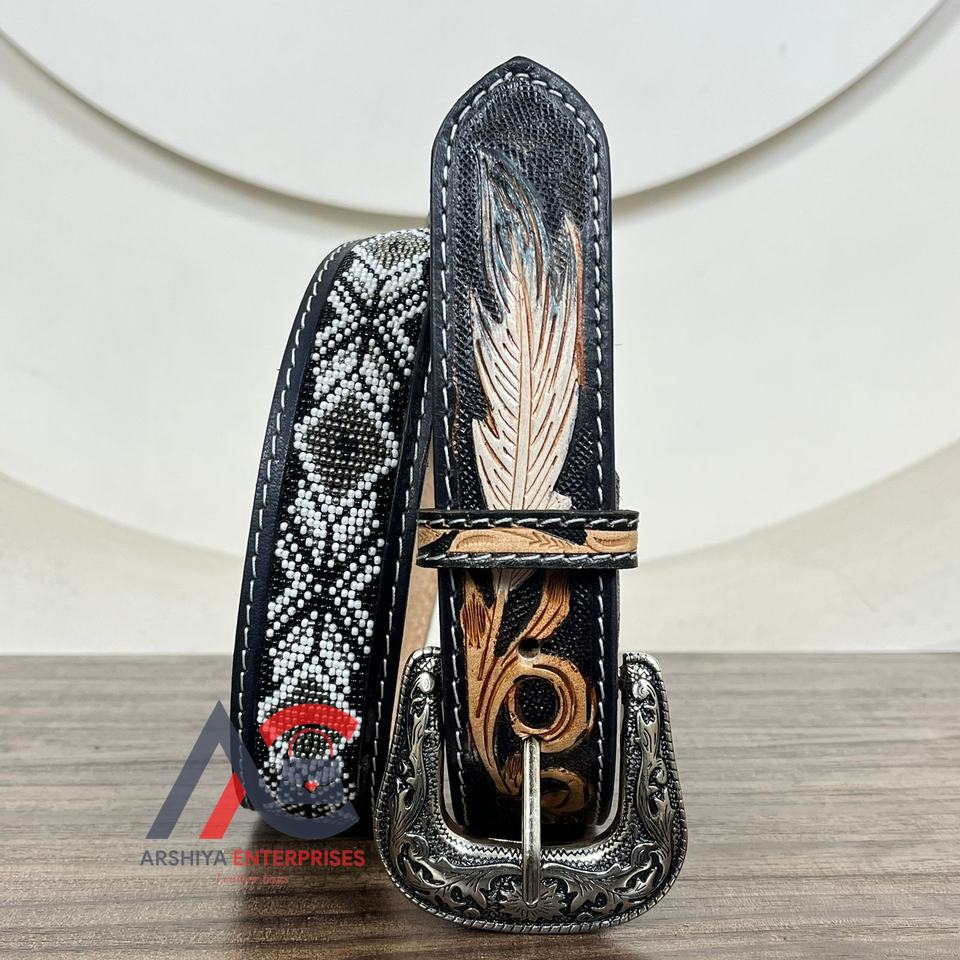 New Custom Design Luxury Western Cowboy Hand Tooled Leather Beaded Belt Alloy Pin Buckle Genuine Leather Feather Designer Belt