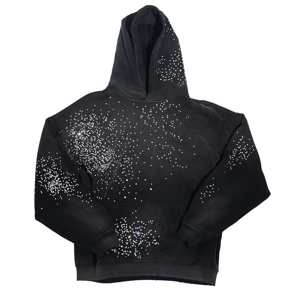 New Custom OEM 100% Cotton Breathable And Soft Heavyweight Fleece Pullover Hoodie With Rhinestones And Sunfade Solid Black Color