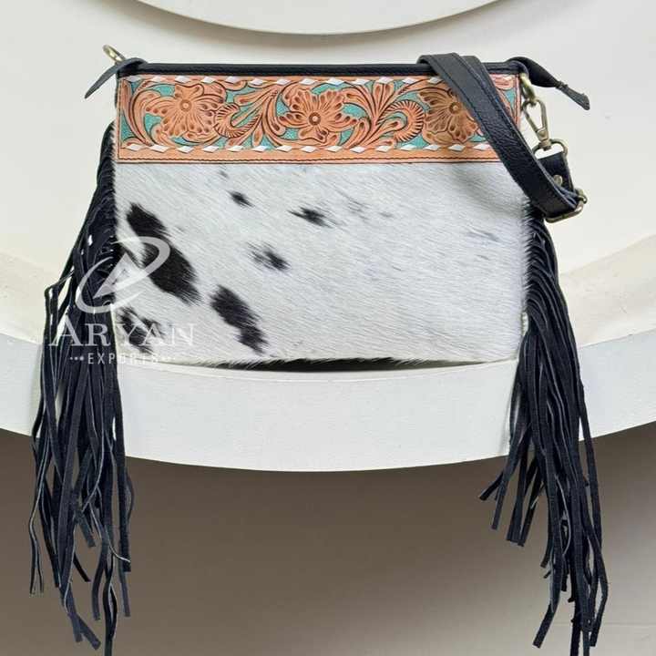 Hand Tooled Cowhide Leather Fringe Crossbody Bag
