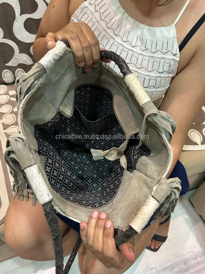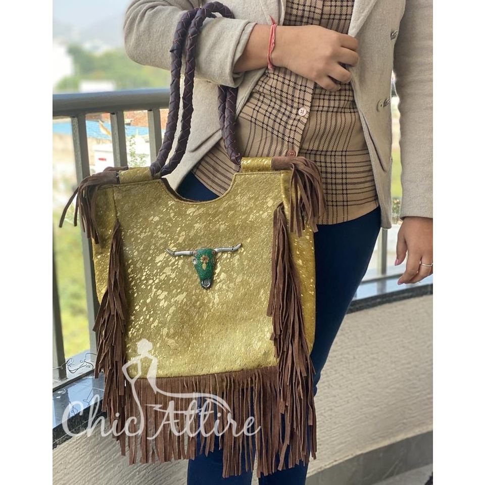 Product name:Genuine Hair On Metallic Cowhide Leather Fringe Tote Handbag