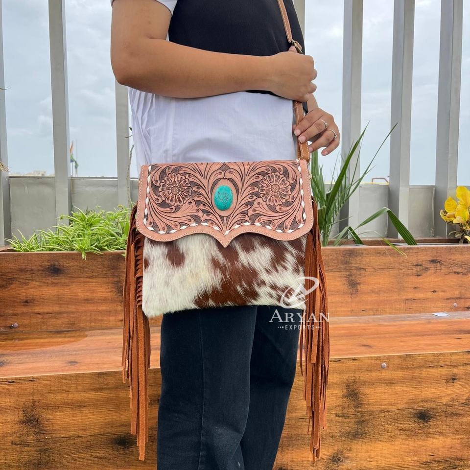 Hand Tooled Cowhide Leather Fringe Crossbody Bag