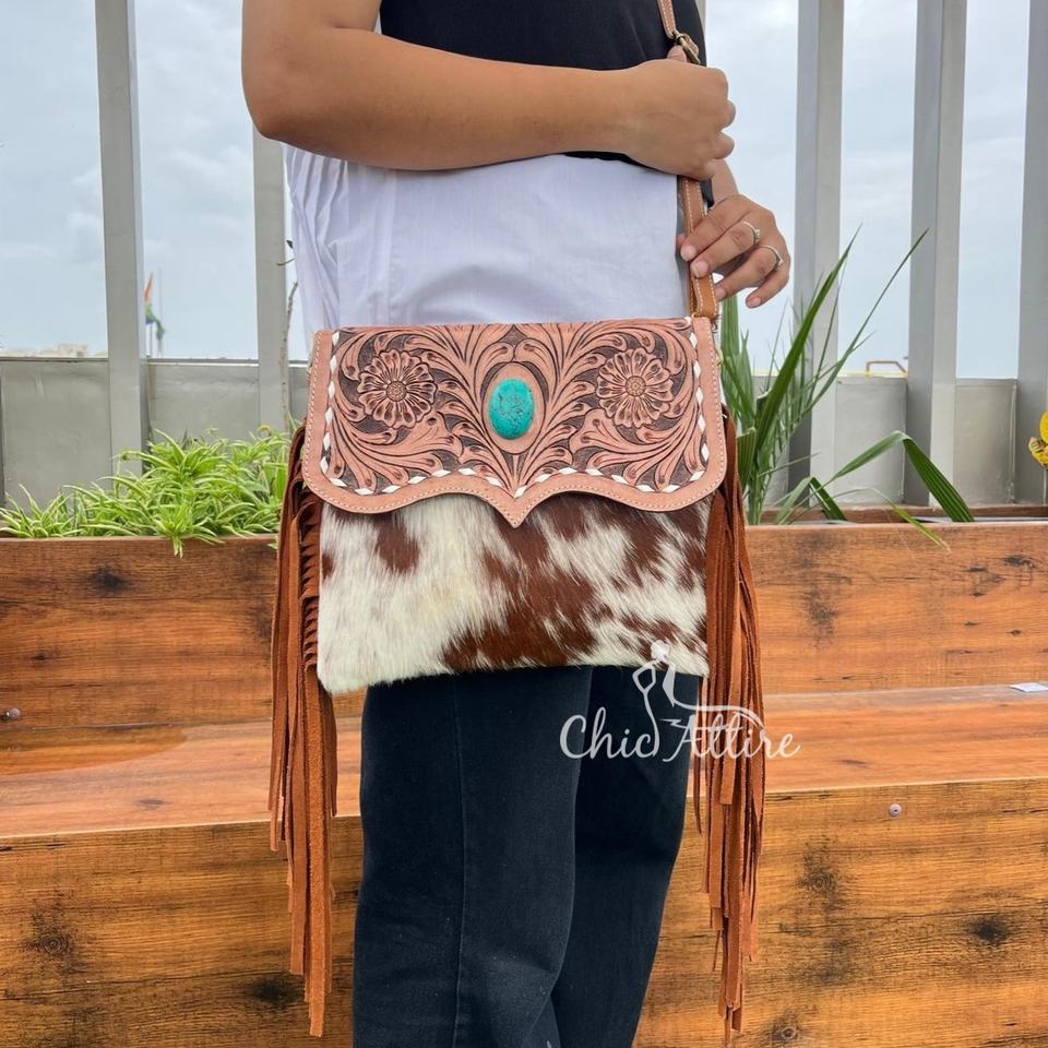 Product name:Hand Tooled Cowhide Leather Fringe Crossbody Bag