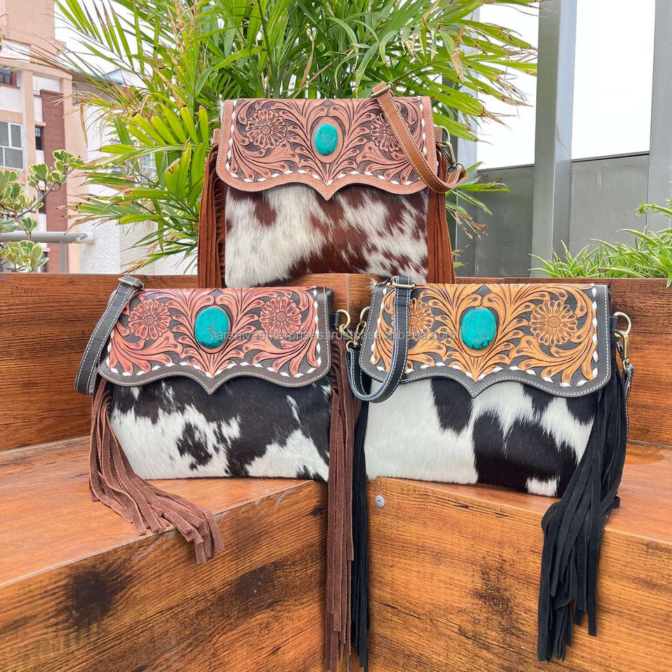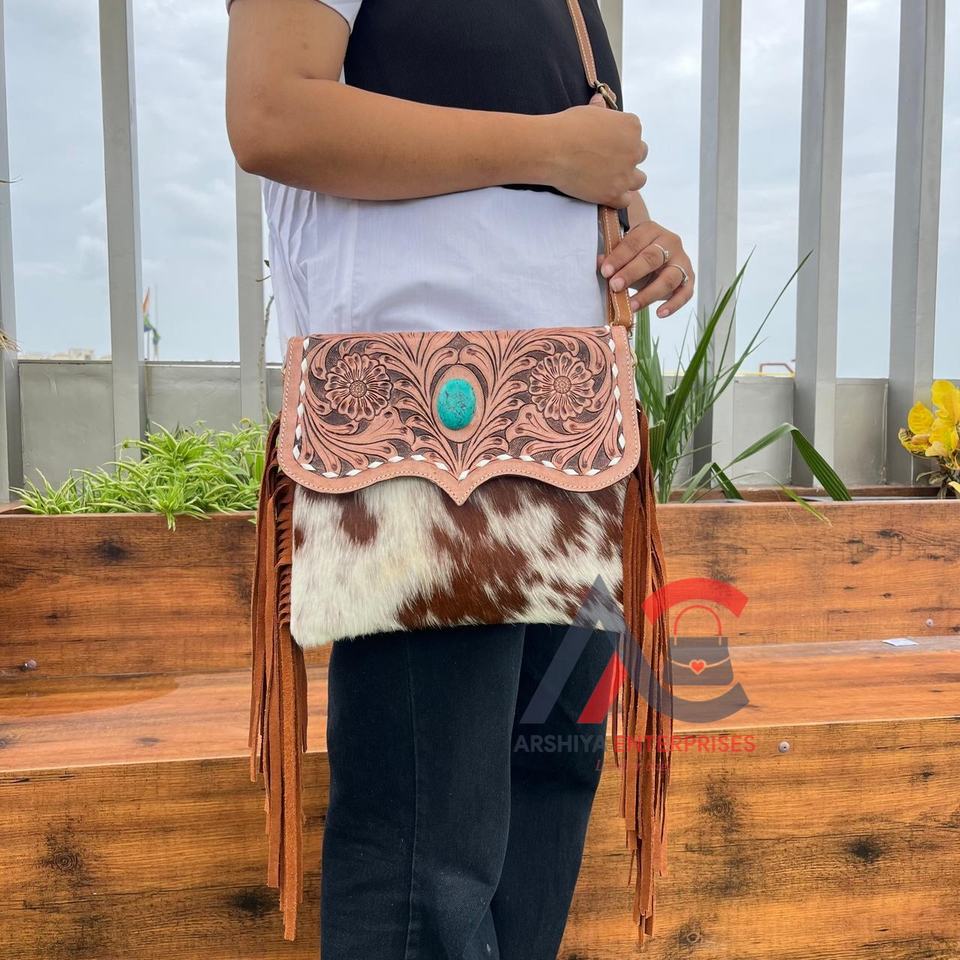 Hand Tooled Cowhide Leather Fringe Crossbody Bag