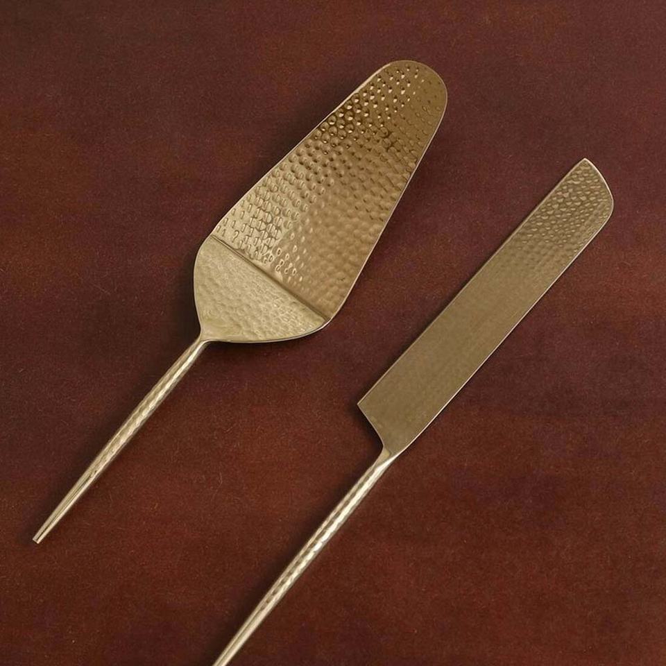 New Customized logo Stainless Steel Full Hammered Round Long Handle Gold Cake Server and Slicer Set for Wedding Use
