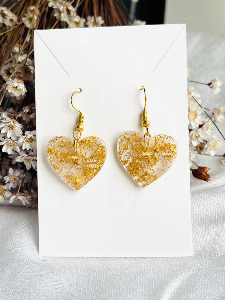 Custom Transparent Heart Shape Epoxy Resin Earrings with Embedded Gold Flakes, Lightweight Handmade Romantic Jewelry for Women