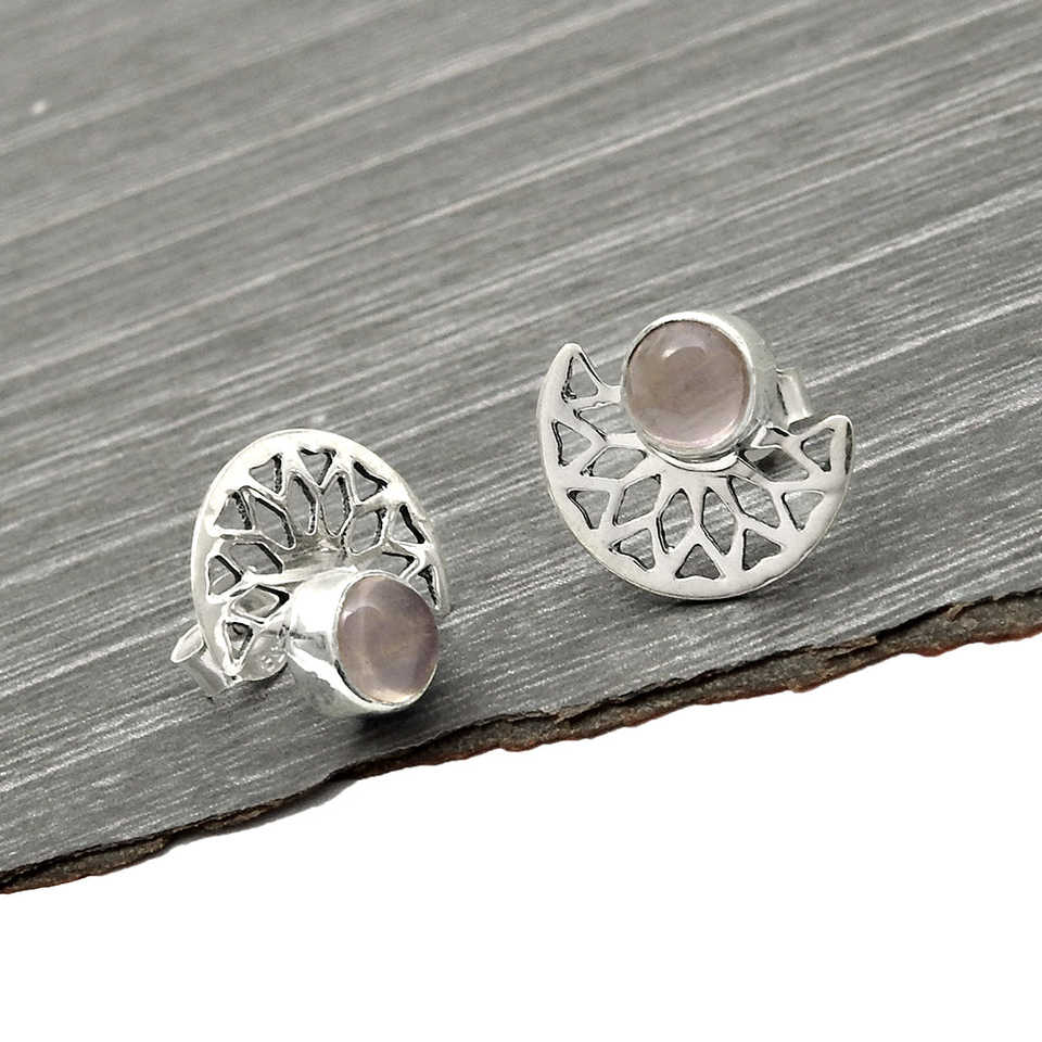 New Design 925 Sterling Silver Natural Rose Quartz Gemstone Round Shape Stud Earrings For Woman Handmade Bohemian Jewelry
