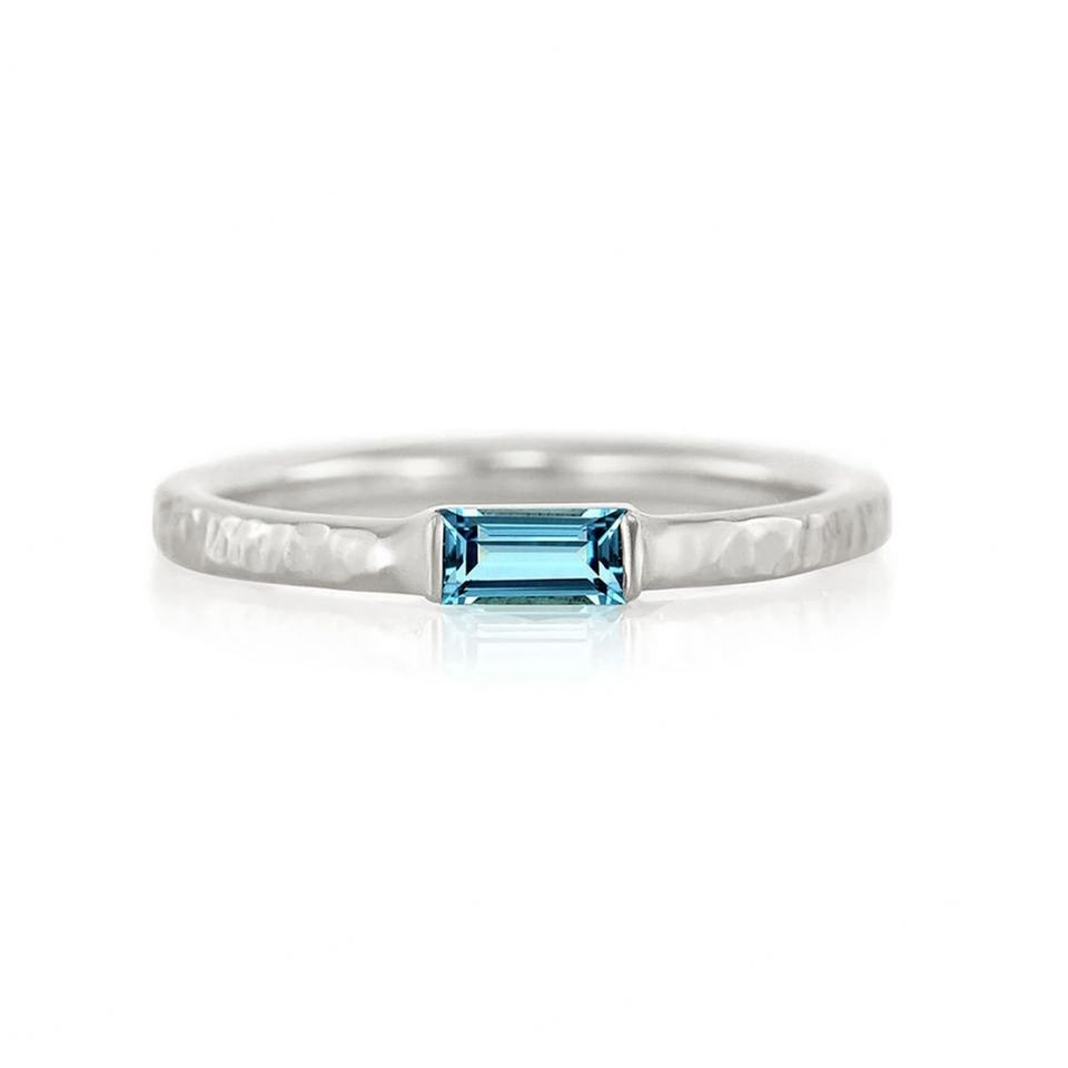 New Design 925 Sterling Silver Single Natural Baguette Blue Topaz Gemstone Stone Delicate Hammered Band Stacking Ring