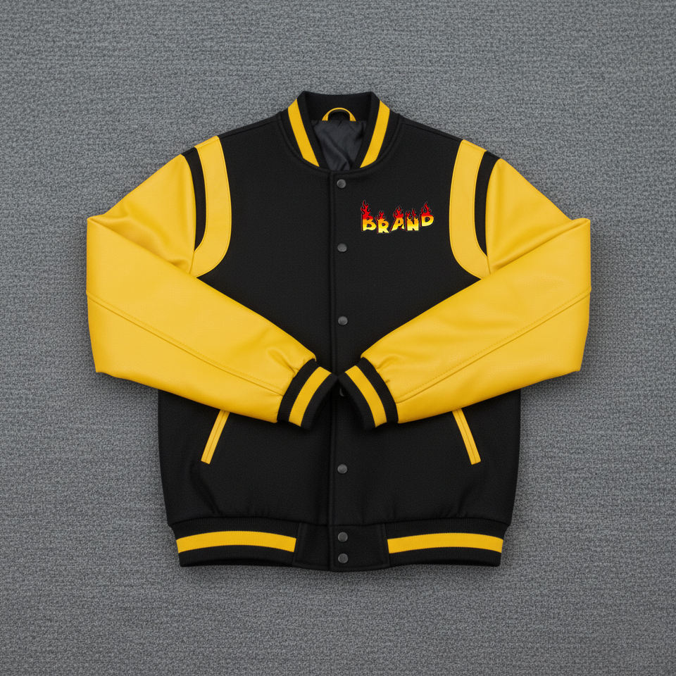 New Design Black & Yellow Camouflage Dyed Leather Sleeves Quilted Cotton Filled Women's Winter Varsity Baseball Jacket