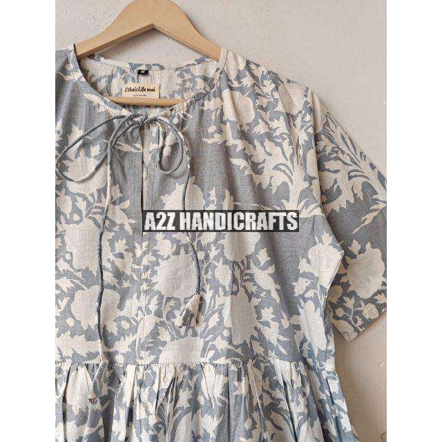 New Design Block Print Vintage Floral Women Dress Bohemian Long Sleeve V Neck Cotton Soft Woven Cotton Sustainable Beach Dress