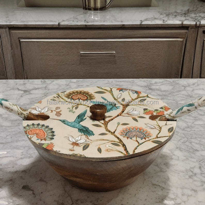 New Design Blossom Enamel Wooden Bowl Decoration Wooden Bowls Large Enamel Printed mango Wood Salad Serving Bowl By FWE