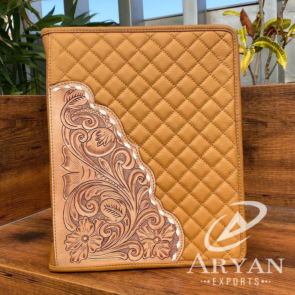 New Design Business Portable A4 Size Hand Tooled Leather Customized Folder High Quality Custom Quilted Leather Zippered Padfolio