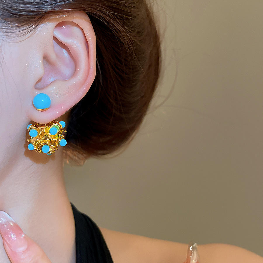New Design Fashion Jewelry Women Studs Earrings Blue Resin Ball Shaped Hollow out Earrings With Silver Needle
