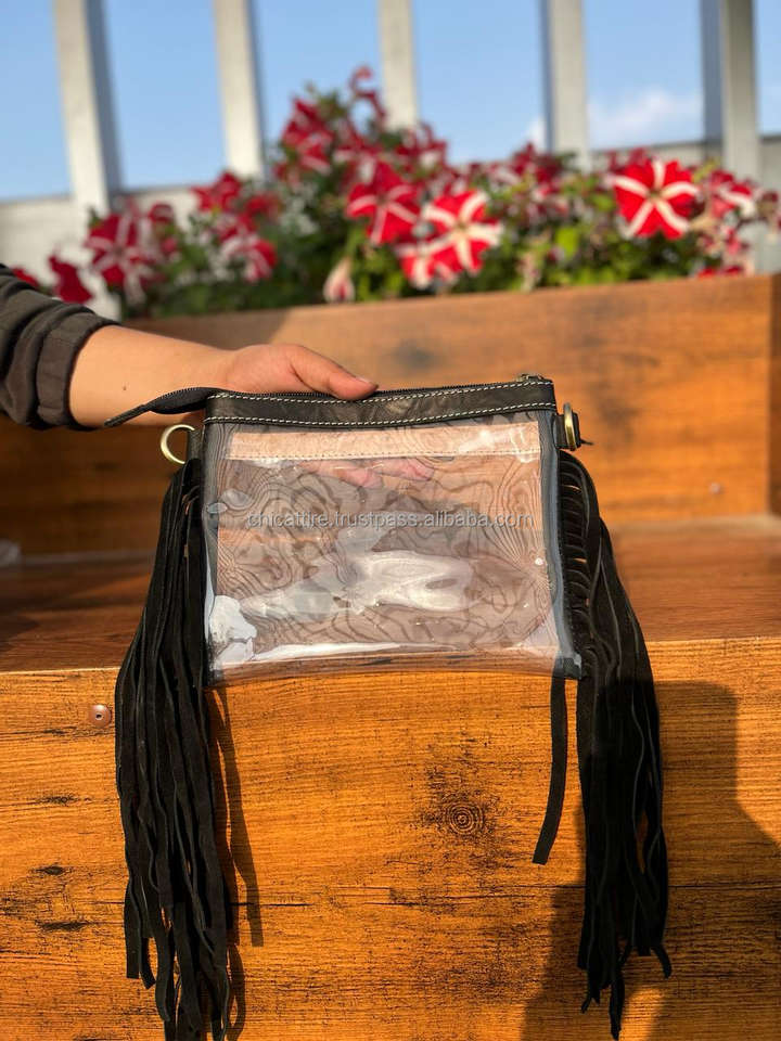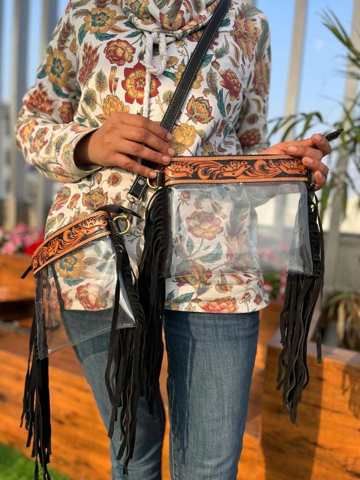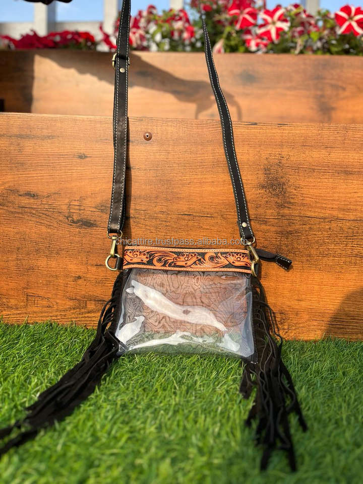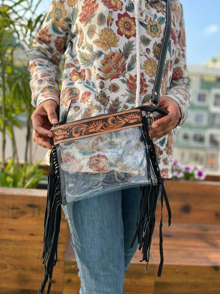 New Design Fringe Transparent Clear Bag Stylish Hand Tooled Carving Leather Purse Multi Uses Leather Bags for Women's Multi Use
