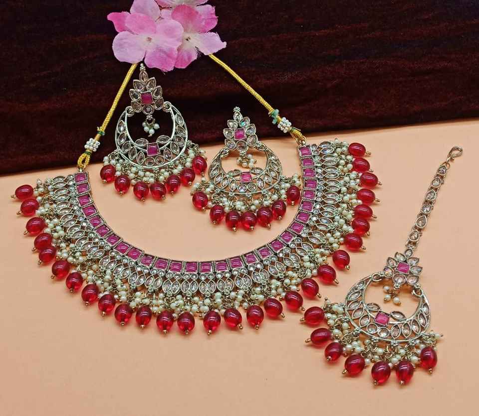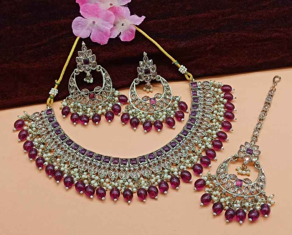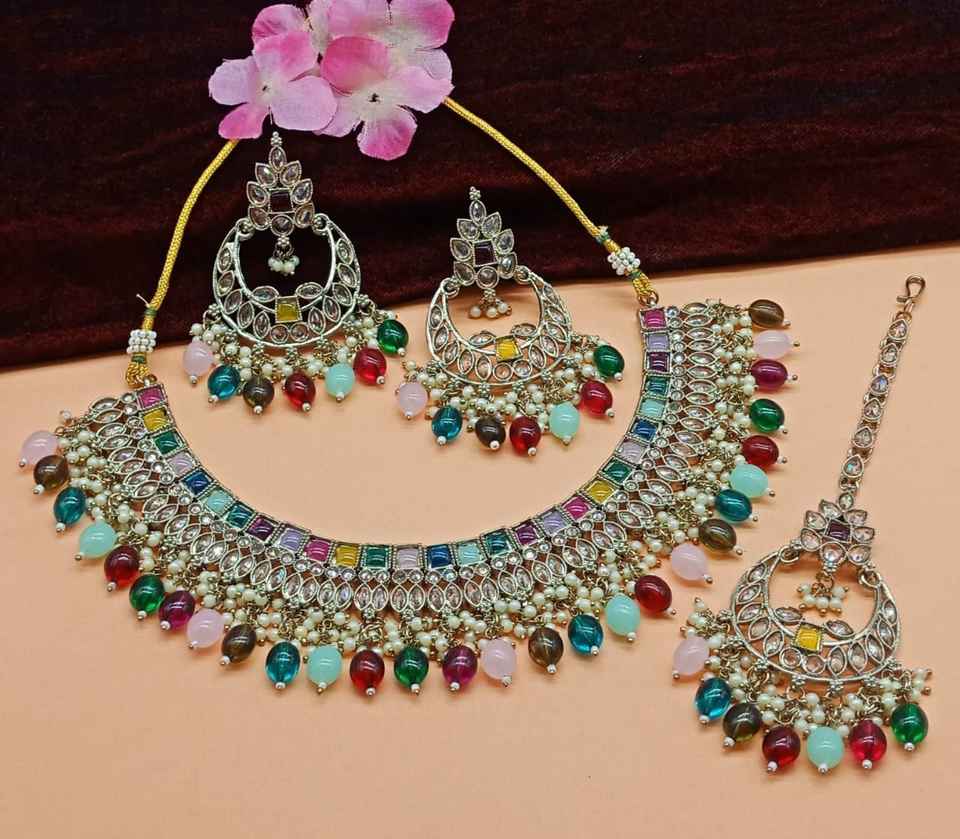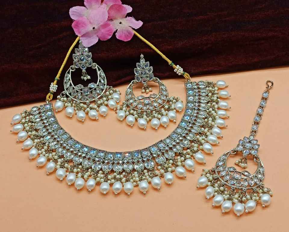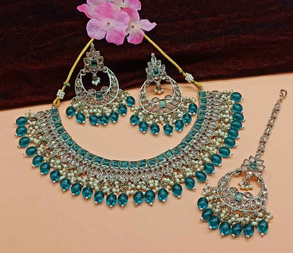 New Design Gold Plated Traditional Drop Pearl & Stone Studded Earring Mangtika Choker Necklace Set & Jewellery Set for Women