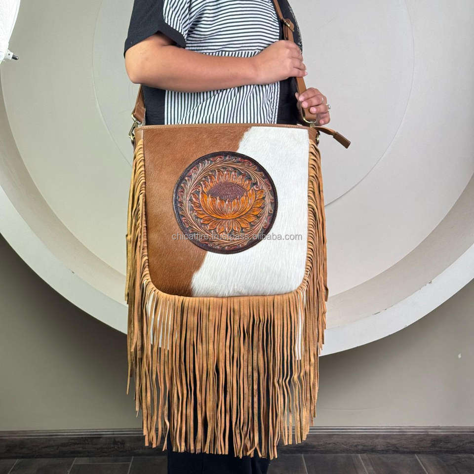 Hand Tooled Cowhide Leather Fringe Crossbody Bag