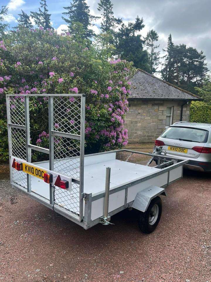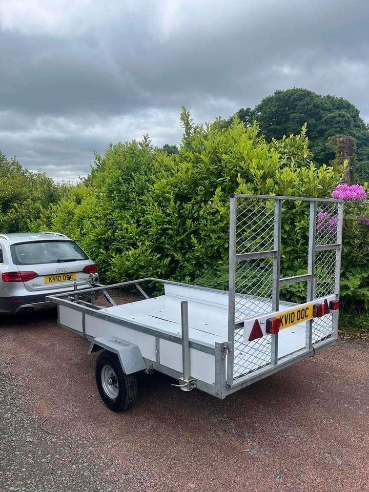 Large Rear Door F7523SB 750Kg Tipping Trailer with Tiltable Box 225cm Interior Length White Exterior LED Lights Rails