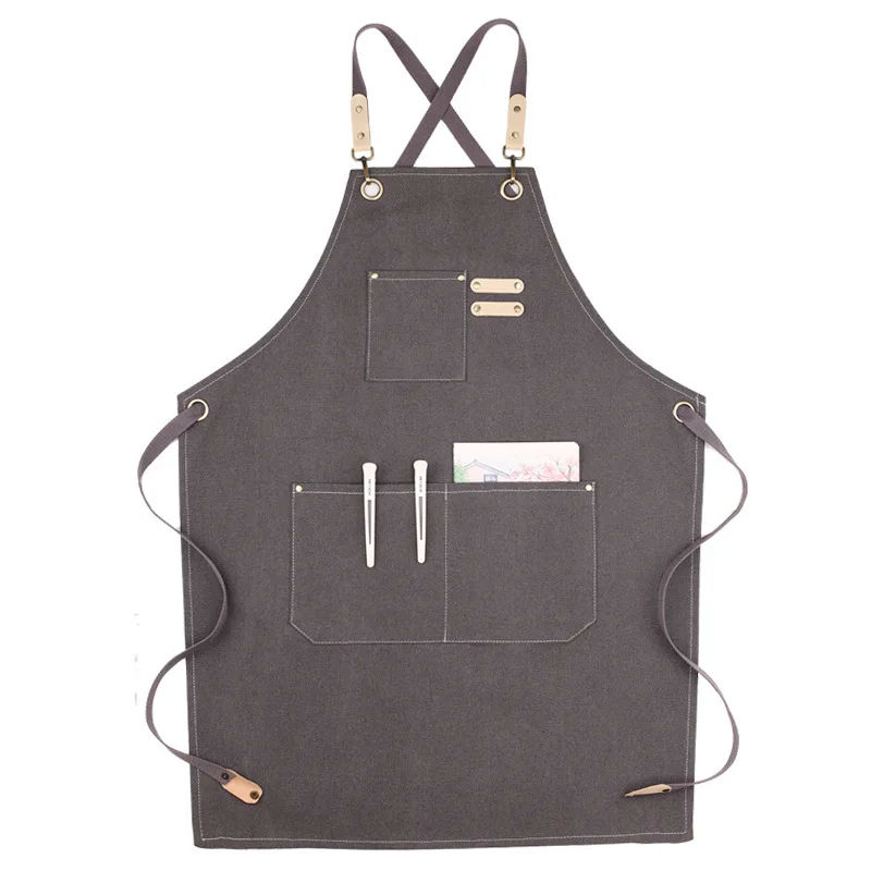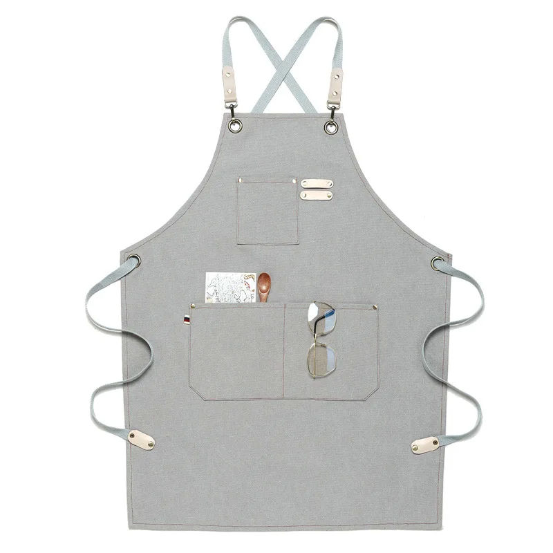 New Design Heavy Duty Thick Canvas Anti Dirty Custom Cross Back Barber Apron Two Tone Canvas Aprons with Multifunction Pockets