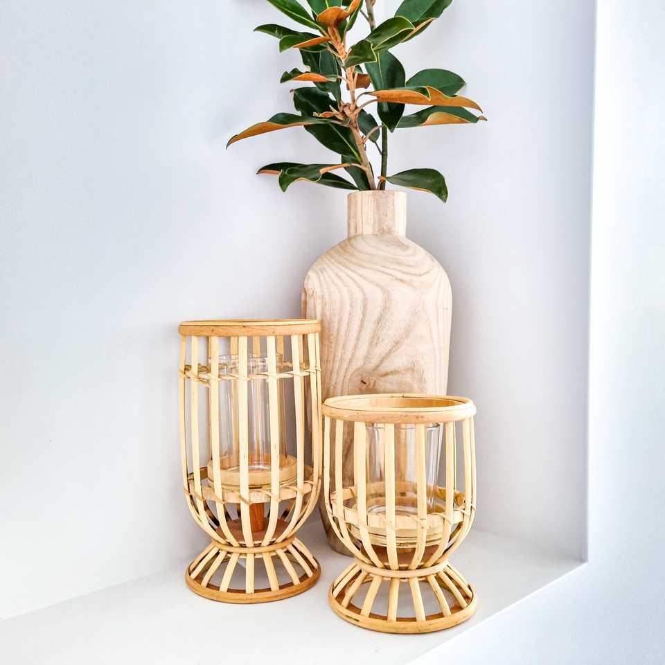 New Design Long Stem Glass Candle Holder Rattan Stand Holders for Candles Handmade Lantern Tabletop Decoration
