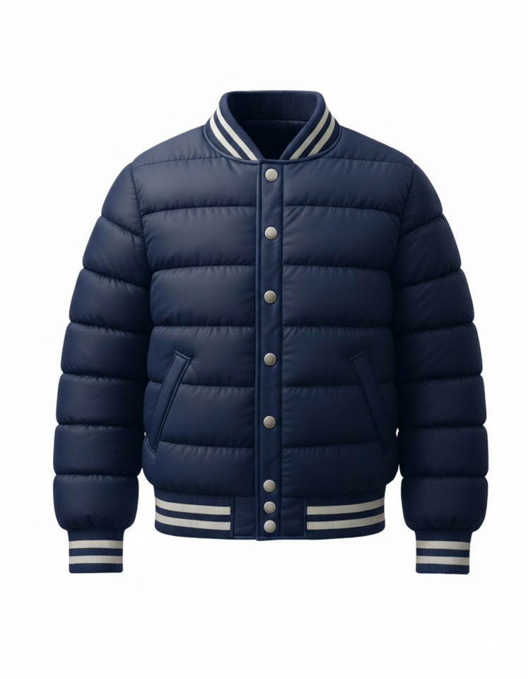 New Design Men’s Blue Varsity Style Puffer Jacket Winter Quilted Snap Button Bomber Coat Ribbed Collar Streetwear Outerwear