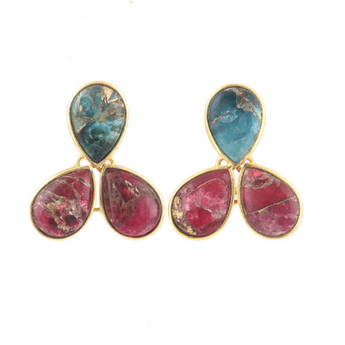 24K Gold Plated Triple Stone Earrings New Design Mohave Apatite Ruby Copper Turquoise Push Back Stud Brass Jewelry for Women