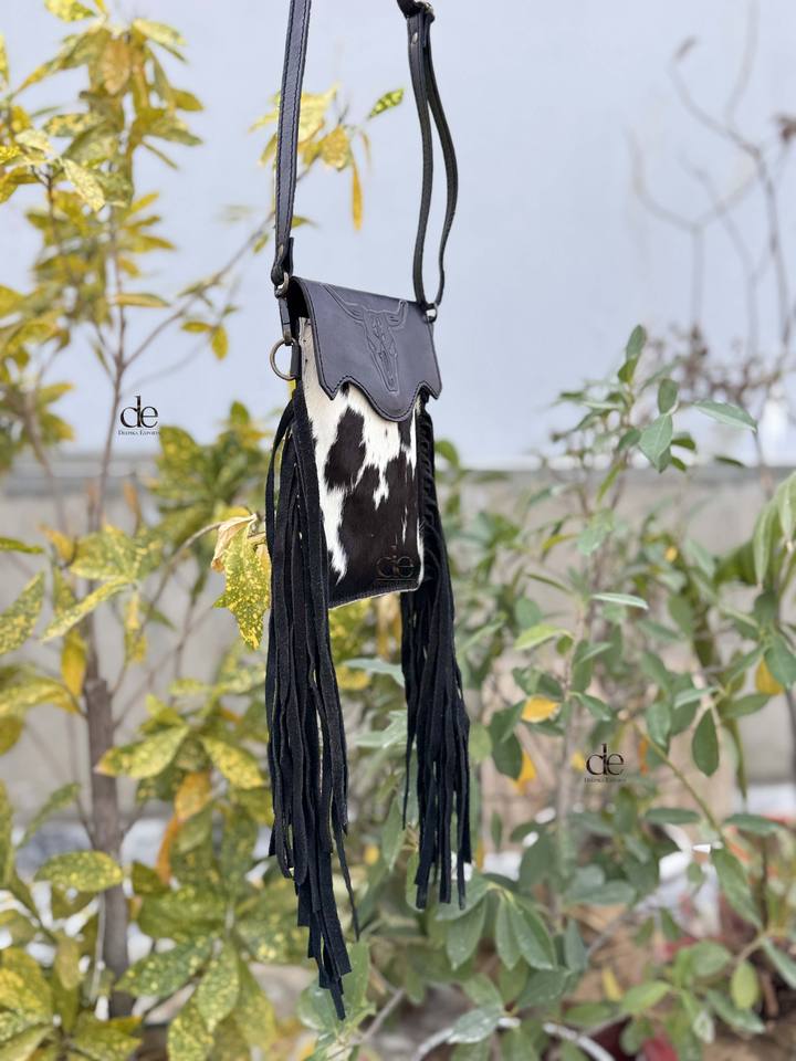 New Design Phone Purse Handbag Real Cowhide Fur Fringe Hand Tooled Carving Sling Bag Small Size Bags Wristlet Pouch Sling Bag