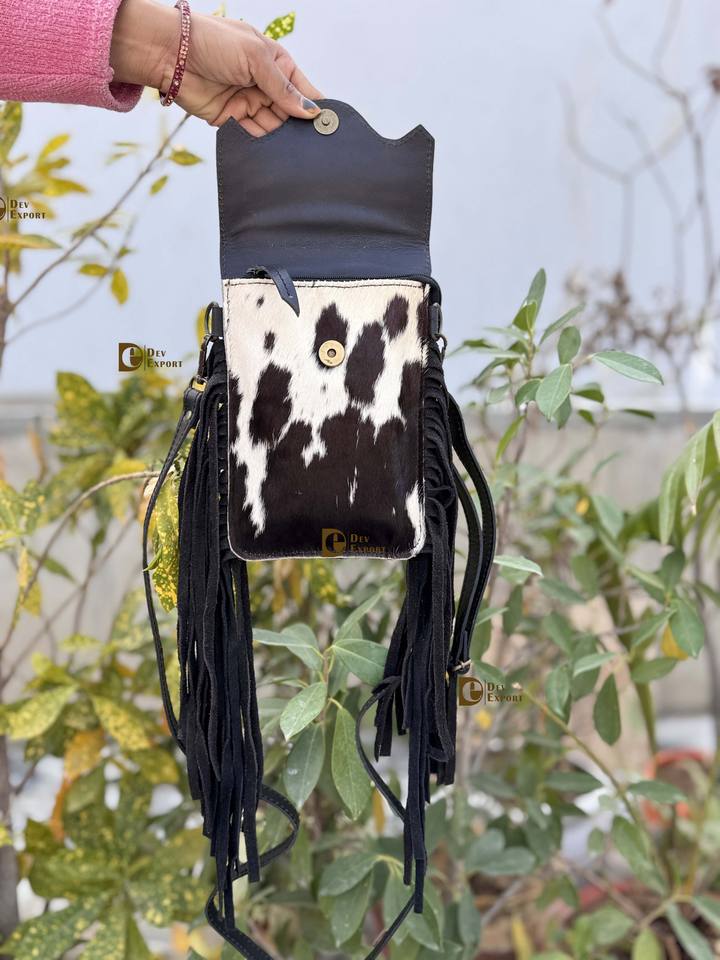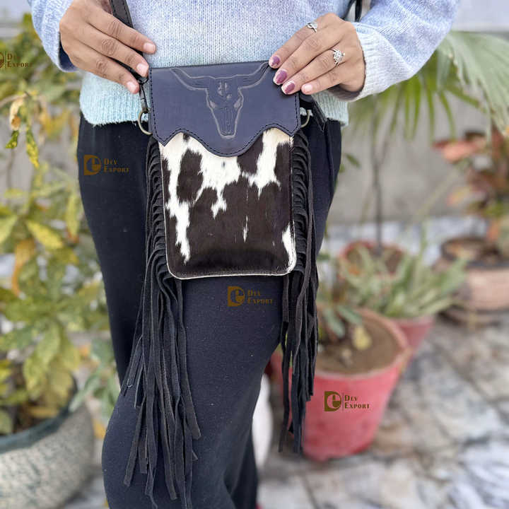 New Design Phone Purse Handbag Real Cowhide Fur Fringe Hand Tooled Carving Sling Bag Small Size Bags Wristlet Pouch Sling Bag