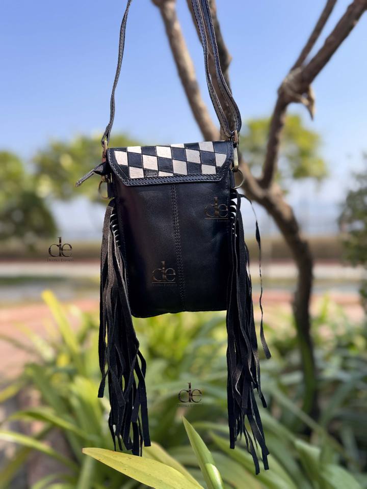 New Design Phone Purse Real Cowhide Fur Leather Fringe Hand Tooled Carving Checker Pattern Sling Bag Small Size Bags Pouch Bag
