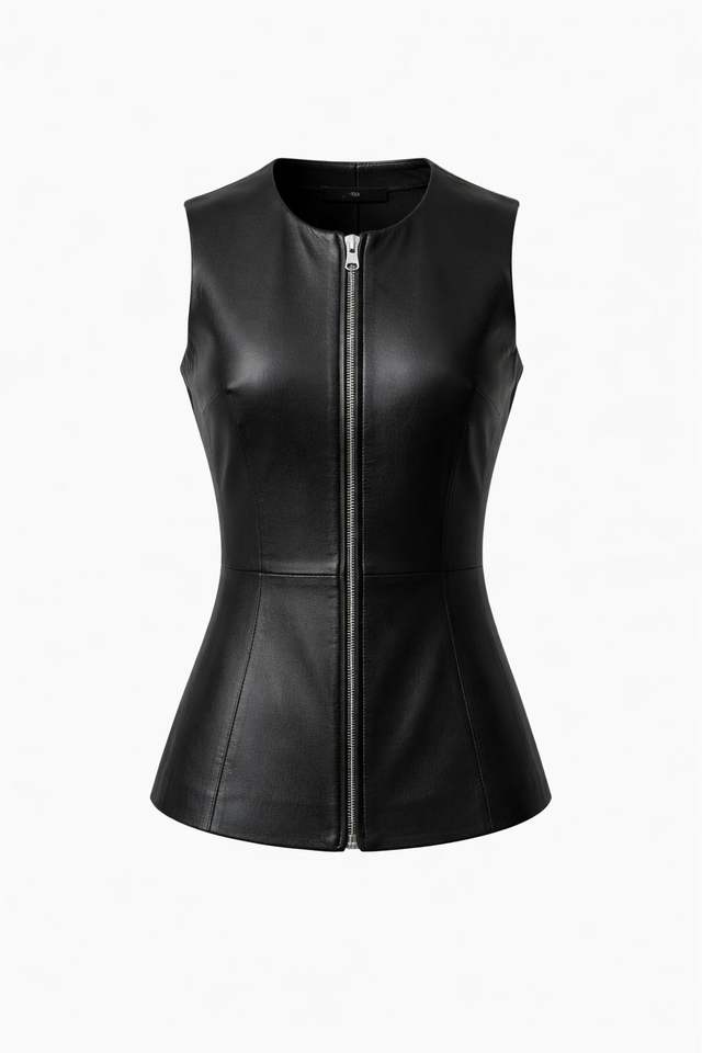 New Design Women Genuine Black Leather Vest with O Neck and Zipper slim Fit Jacket