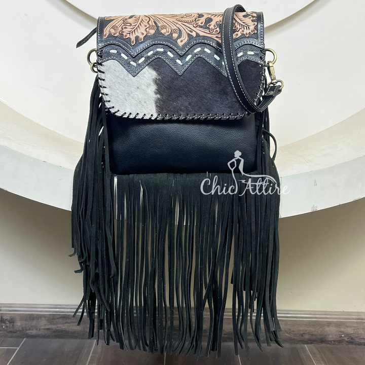 Product name:Hand Tooled Cowhide Leather Fringe Crossbody Bag