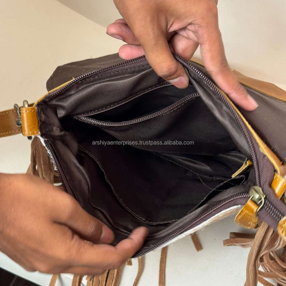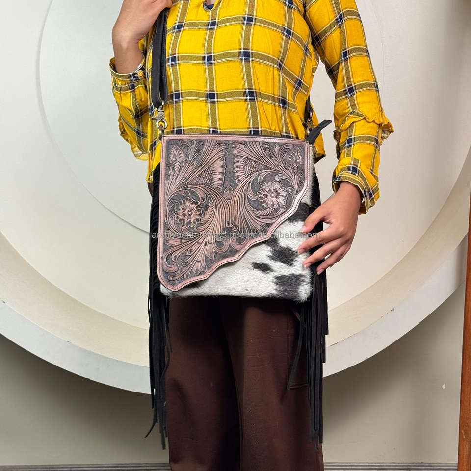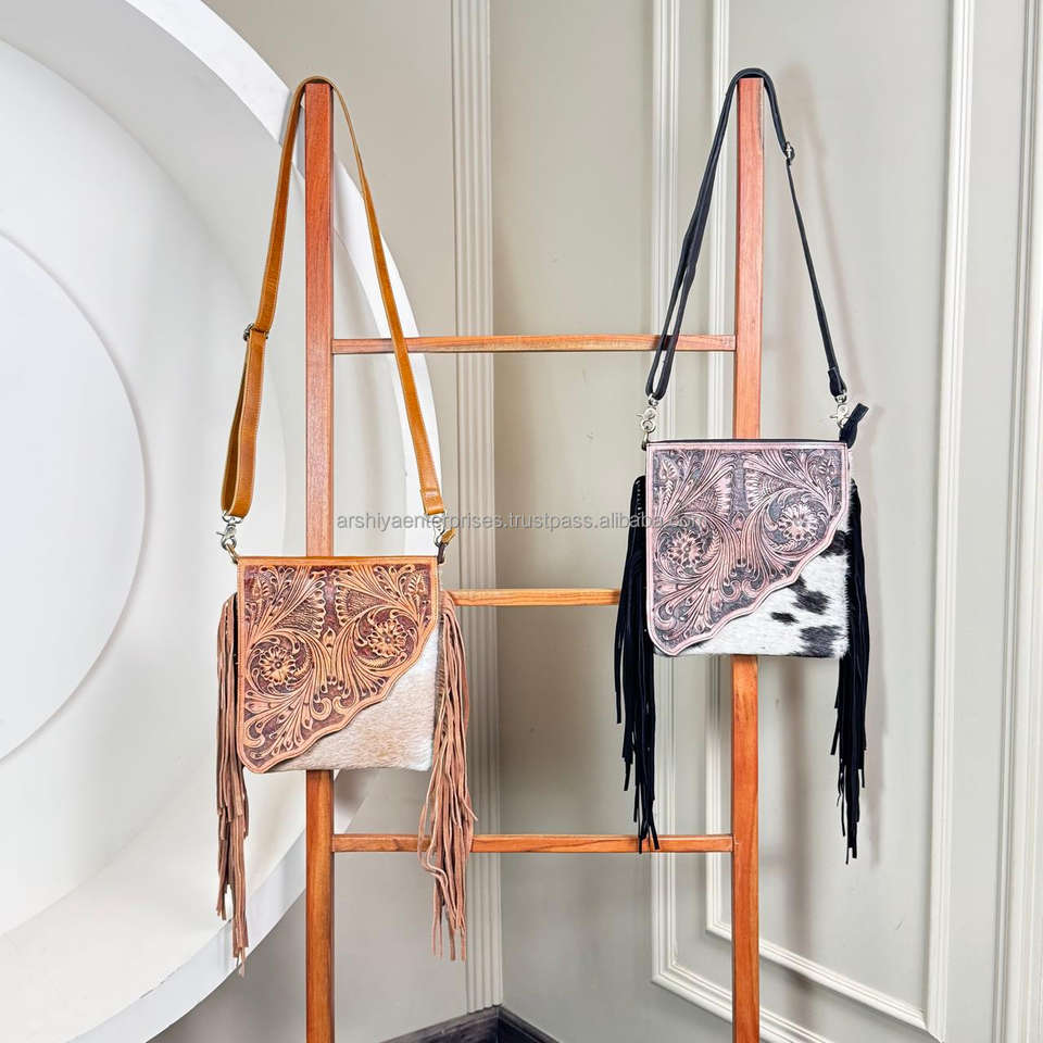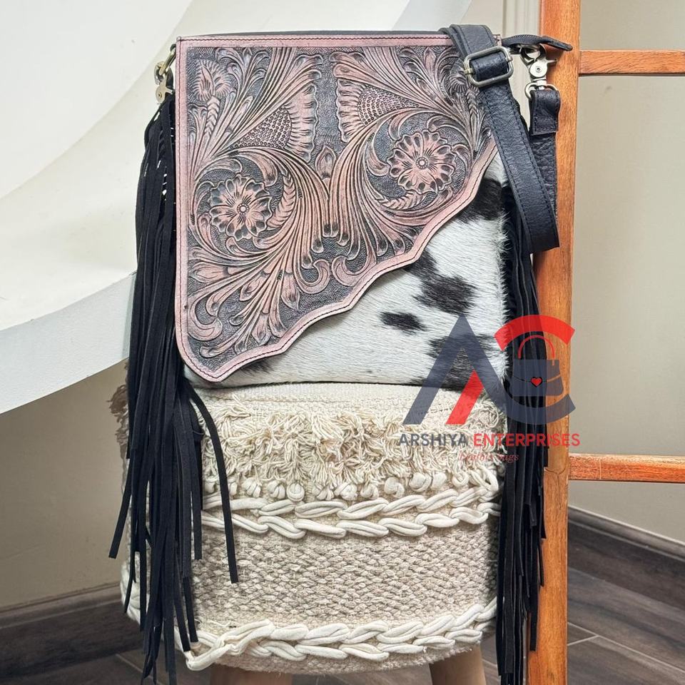 Hand Tooled Cowhide Leather Fringe Crossbody Bag