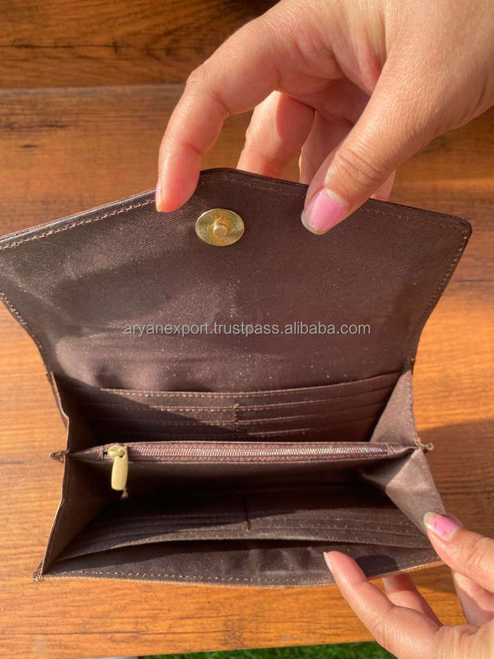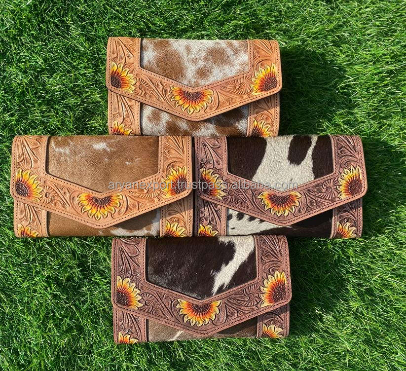 Hot Selling Handmade Tooled Carving Cowhide Fur Leather Wallet Snap Button Phone Case Clutch For Women Daily Use Office Shopping