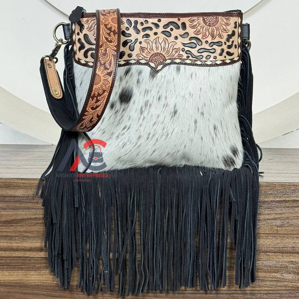 Product Name:Hand Tooled Cowhide Leather Fringe Crossbody Bag