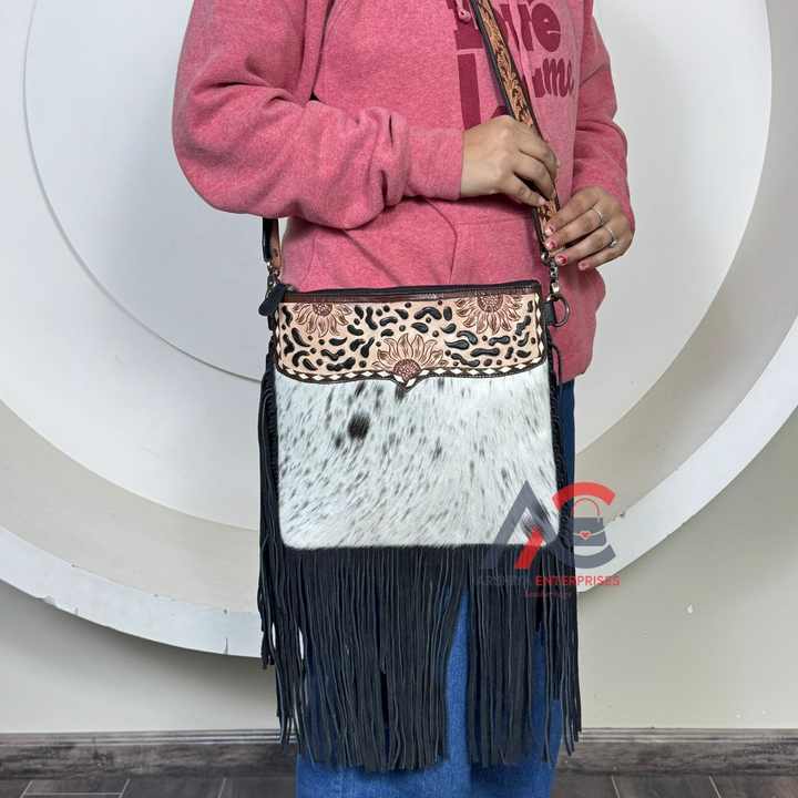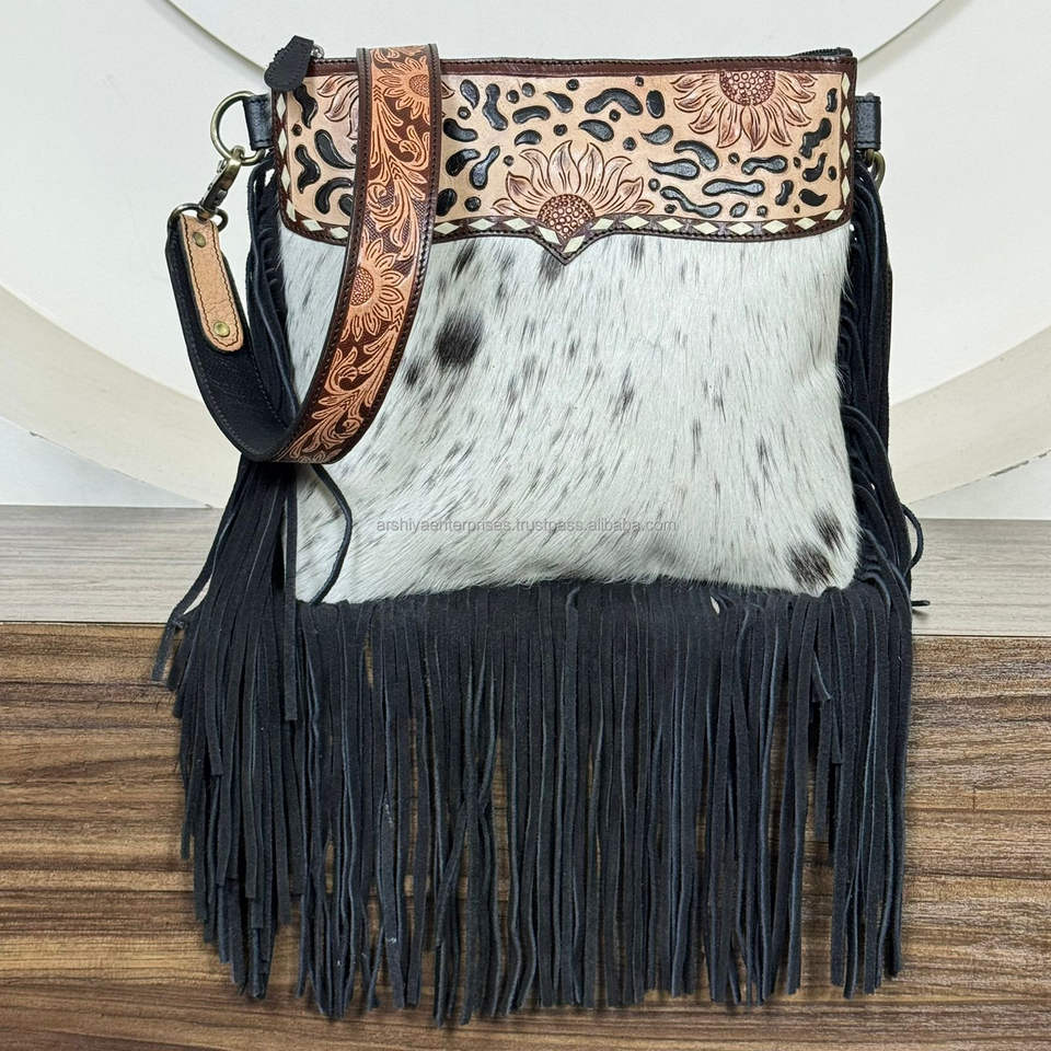 Product name:Hand Tooled Cowhide Leather Fringe Crossbody Bag