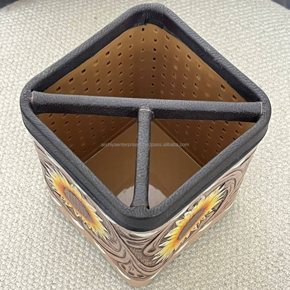 New Designer Hand Tooled Genuine Leather Round Pencil Pen Holder March Expo Western Style Desk Organizer Office School Accessory