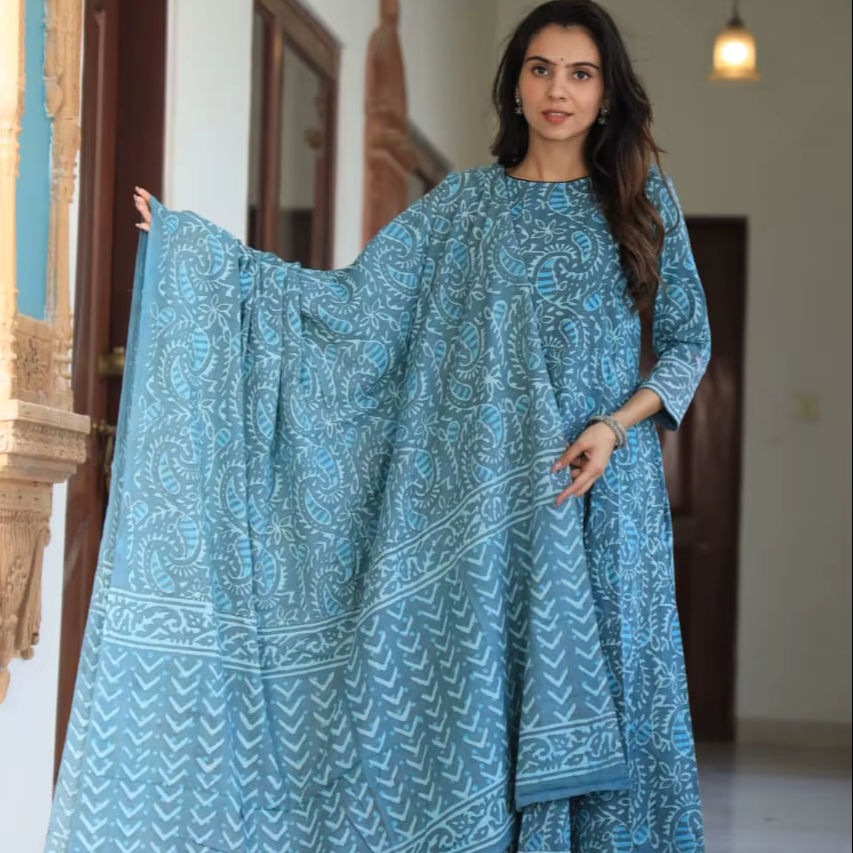 New Designer Party Wear Light Floral Indigo Hand Drawn Printed Cotton Traditional Ethnic Women's Kurta / Kurti Dupatta Pant Set