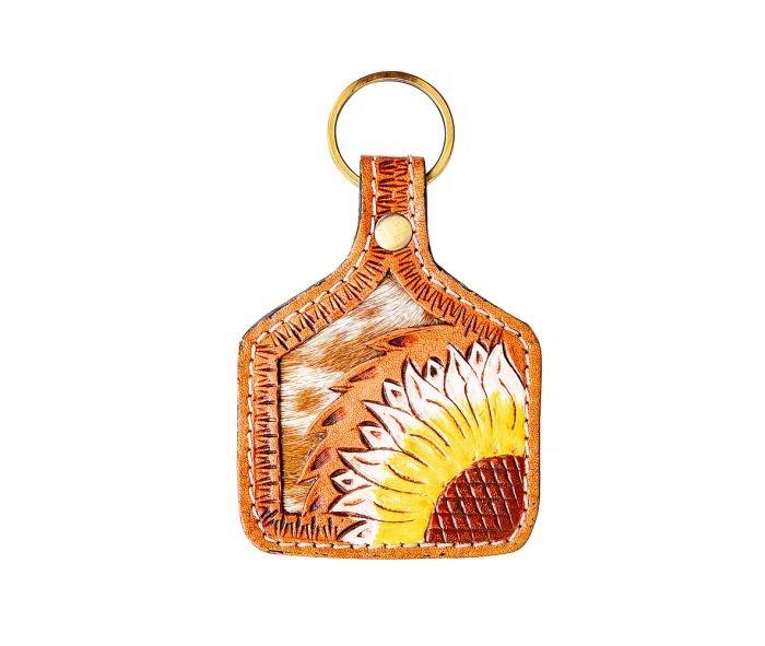 New Designer Sunflower Tooled Keychain Cowhide Leather Trendy Western Cowboy Style Accessories Bag Sunflower Tooled Keychain